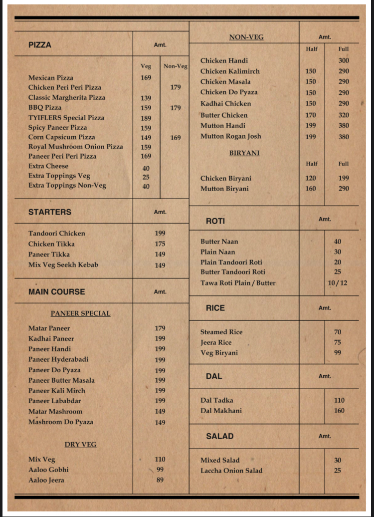 With an extensive menu, TIFFLERS CAFE excels in delicious pizzas such as the Mexican Pizza and Tyiflers Special Pizza, appealing to both classic and adventurous palates. For non-vegetarians, options like Butter Chicken and Mutton Rogan Josh are must-tries, showcasing rich Indian flavors.